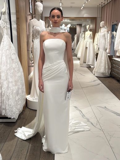 A strapless princess gown with a dramatic ballgown shape, crafted from the brides choice of Mikado or Satin. Perfect for brides looking for opulence and a commanding presence.