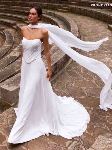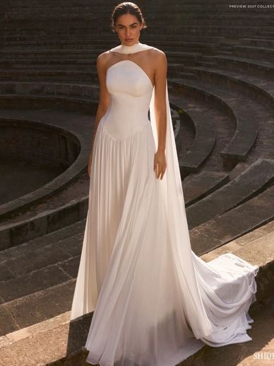 A beautiful strapless Pleaded Chiffon A-Line, Modern and classy with a soft Basque waist