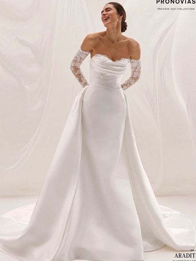 Aradite is a beautiful mixture of Soft Mikado and Corded Lace, complimenting the mermaid silhouette and sweetheart neckline. Options of Overskirt, and sleeves