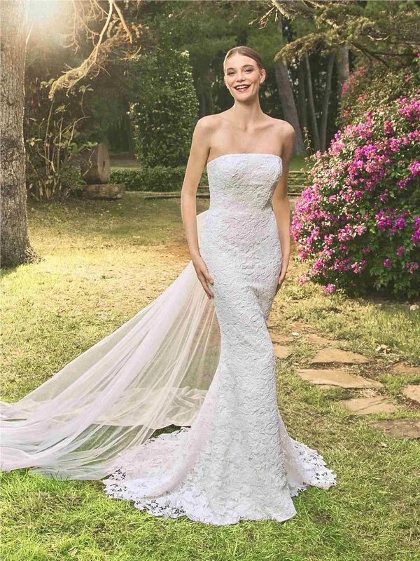 Bold and sculptural, this strapless guipure gown redefines bridal elegance. The mermaid silhouette flatters the figure, while the textured lace adds a rich, tactile dimension to the look.