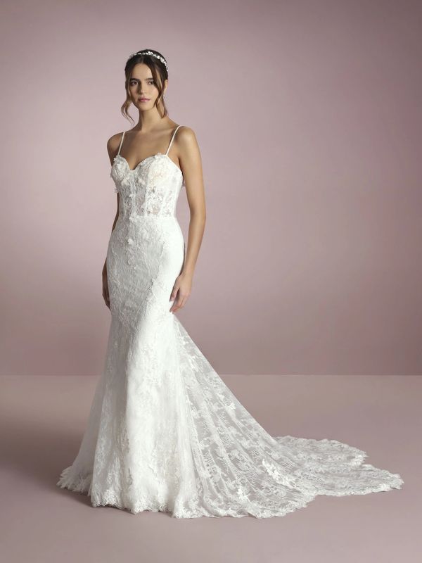 EBISU is an elegant mermaid cut dress entirely made in Chantilly lace. Its design includes lace and rhinestone details all over the model, a reinforced corset-like bodice with a sweetheart neckline, delicate thin straps and a figure-hugging skirt that opens from the knee to give way to a spectacular lace train.